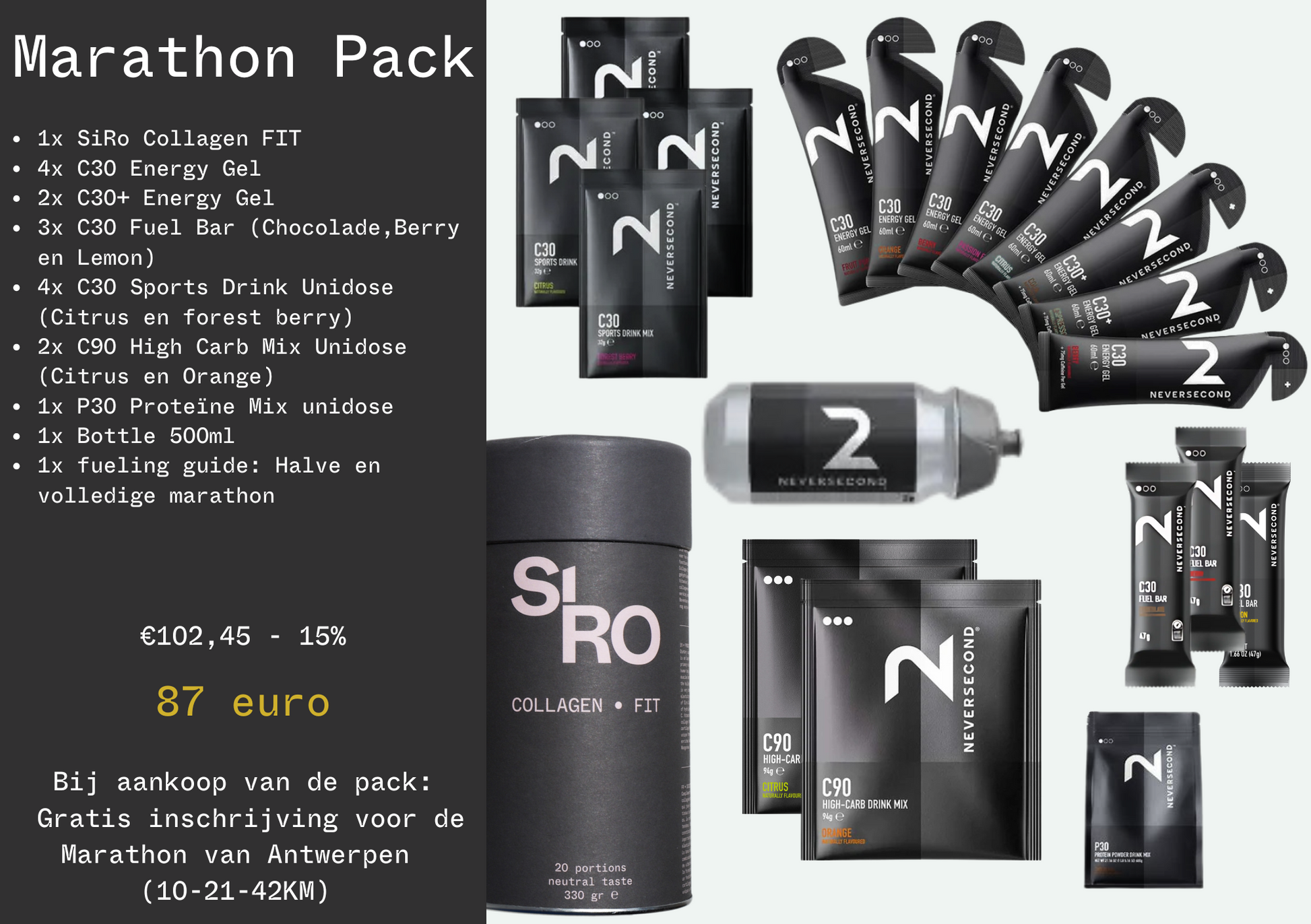 The SiRo x Neversecond Marathon Pack is your all-in-one solution for optimal marathon performance. This carefully curated bundle combines premium supplements and race-day fuel to support you from start to finish line.