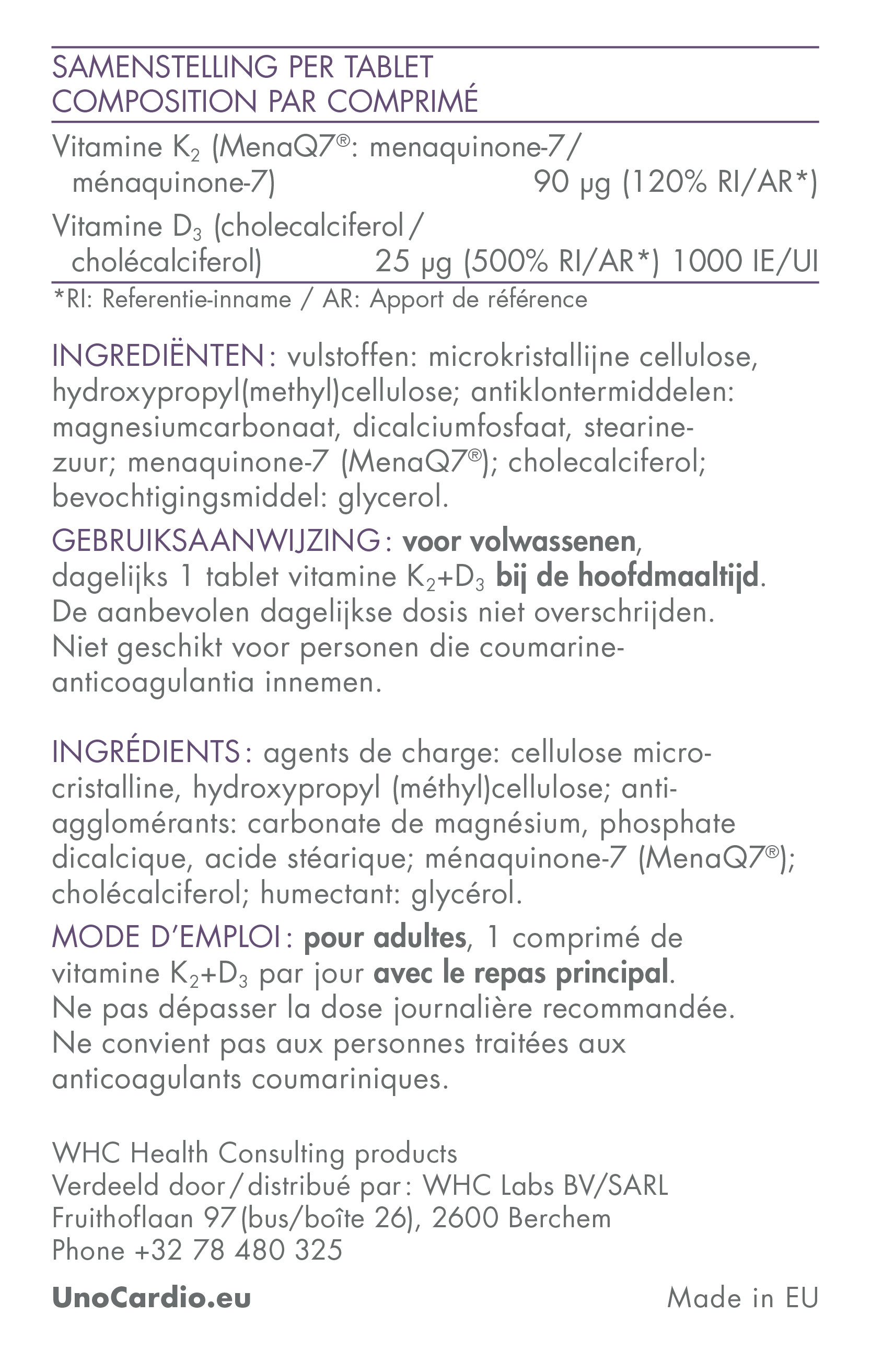 Voor volwassenen, dagelijks 1 pareltablet vitamine K2 + D3 bij de hoofdmaaltijd. De aanbevolen dagelijkse dosis niet overschrijden.